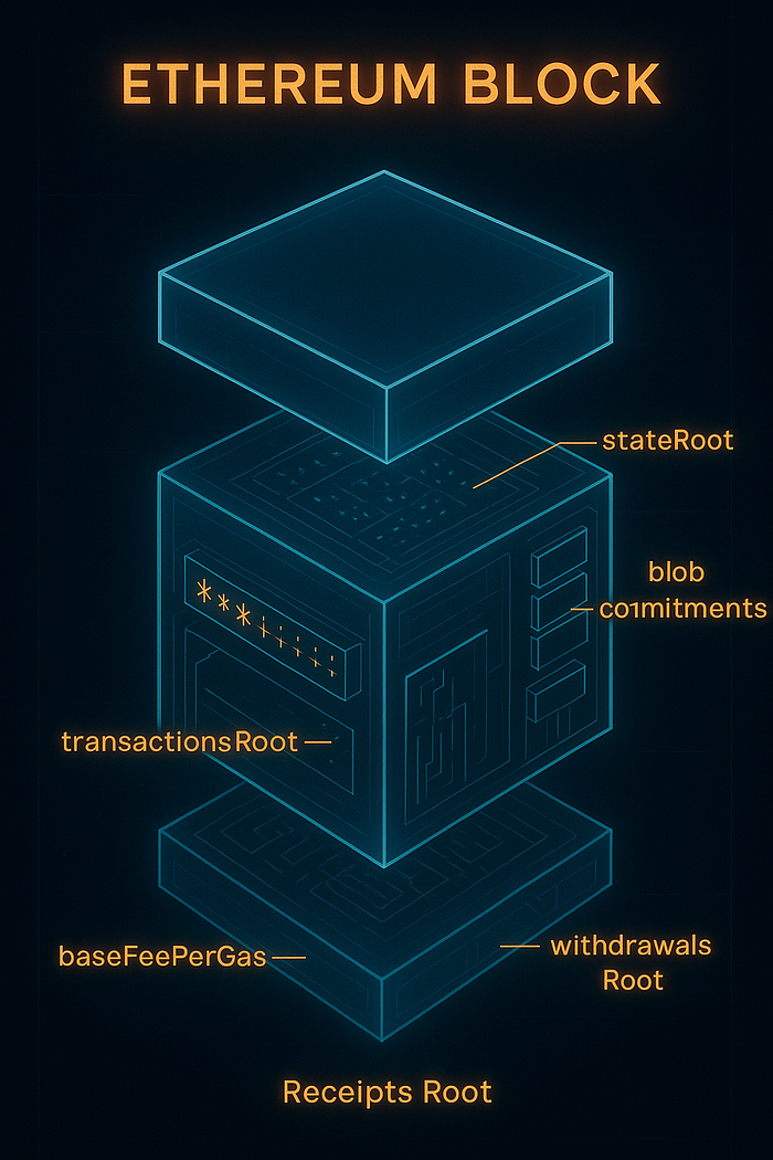 Deeper still: the stateRoot. This is the fingerprint of the entire world at this moment — every ETH balance, every smart-contract storage slot, every DeFi position for 120 million addresses. One byte off in a single DeFi pool in Vietnam and this root would be completely different.