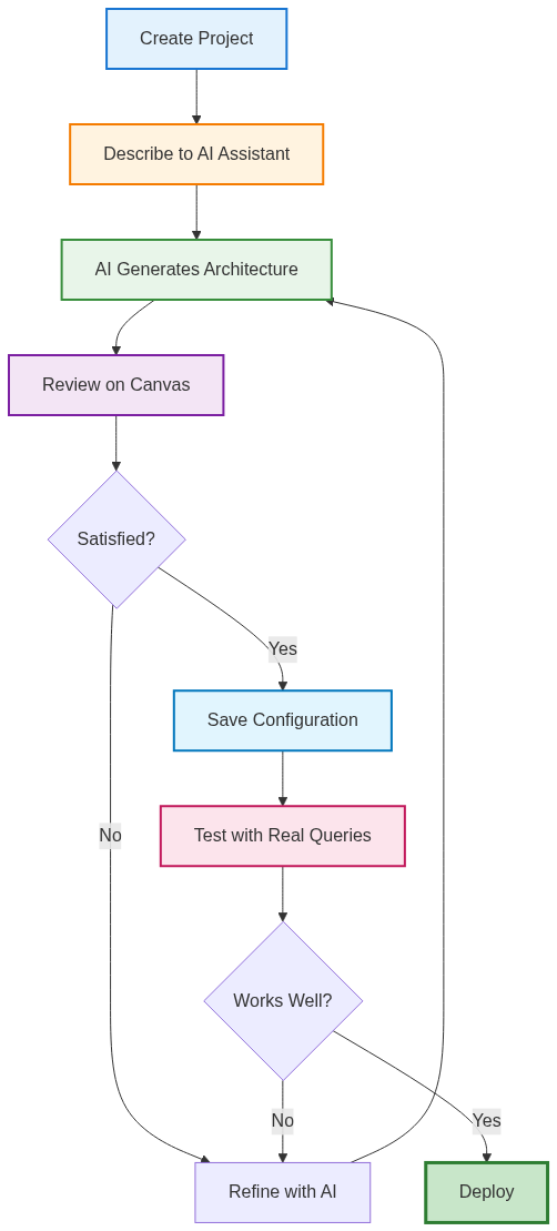 - AI Assistant: Describe what you want in plain English, and the assistant generates the agent architecture for you.