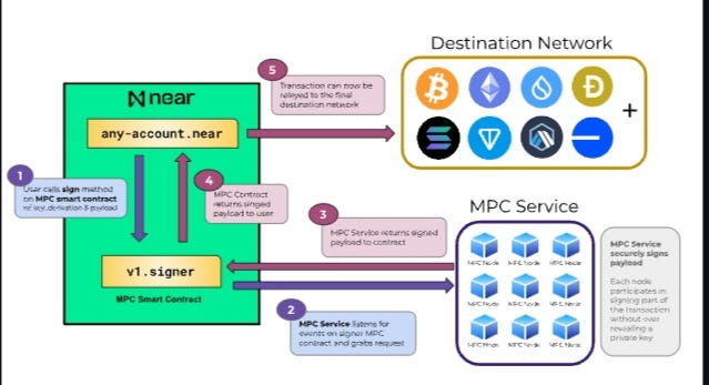 In practice: You want to provide liquidity on Uniswap (Ethereum) and trade on Jupiter (Solana). Normally, that's two wallets, two sets of keys, constant asset shuffling between chains. With chain signatures, it's one account, interacting with both protocols directly. The chains don't need to communicate with each other—NEAR acts as the signing authority for both.